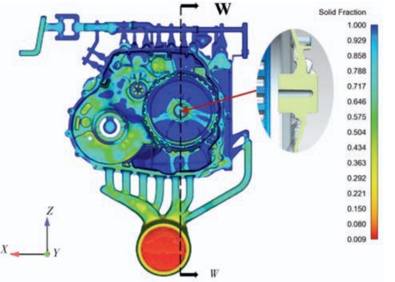 圖7 凝固時間t=9.880 7 s固相分數(shù)圖,橫截面W選取位置示意圖