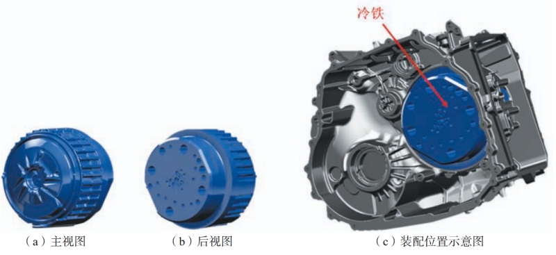 表4 正交試驗結果匯總表 采用極差分析法分析正交試驗的結果表明,模具預熱溫度影響最小,澆注溫度影響最大,壓射速度與壓射比壓的極差在其二者之間。因此,分析得出最優(yōu)的工藝參數(shù)方案為A3B4C2D4,即澆注溫度675 ℃、壓射速度3.5 m/s、模具預熱溫度210 ℃和壓射比壓85 MPa。根據(jù)計算,優(yōu)化后鑄件缺陷體積為17.139 2 cm³,比表4正交試驗中的任何一組數(shù)據(jù)的缺陷體積都要少,因此可以判斷,優(yōu)化工藝參數(shù)可以有效地減少鑄件的缺陷體積。 2.4 特殊部位結構優(yōu)化 根據(jù)圖5中鑄件的凝固過程以及圖7凝固過程中的固相分數(shù)分析,發(fā)現(xiàn)鑄件底部厚大區(qū)域在凝固過程中的溫度明顯高于鑄件其他部位,其凝固過程也落后于整體。這是因為該部位壁厚較大且存在較多孔洞,結構較為復雜,形成了熱節(jié)區(qū)域,冷卻速度較慢。若凝固過慢,導致沒有及時得到周圍金屬液的補縮,則會形成孤立的液相區(qū),縮松縮孔等缺陷極易出現(xiàn)。因此,如圖8所示,若根據(jù)鑄件形狀在此處設置冷鐵,可以降低該區(qū)域整體溫度,加快金屬液的冷卻,達到同時凝固的效果,使鑄件整體凝固時的溫度趨于平衡。
