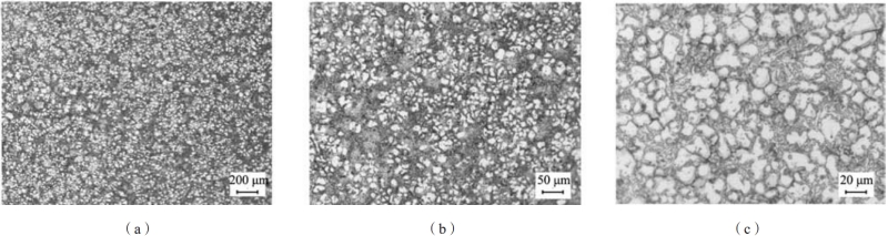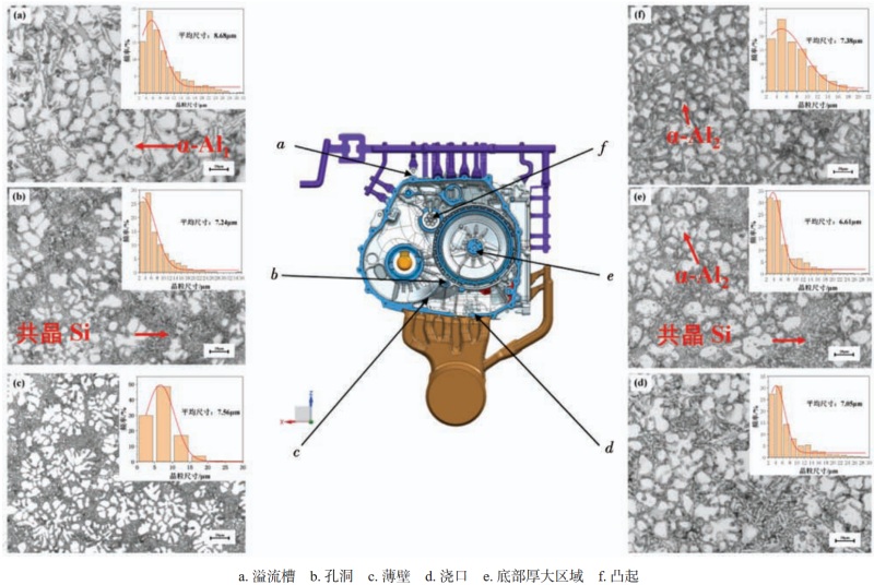 圖9 厚大區(qū)域金相圖 2.5 鑄件組織性能分析 在鋁合金殼體的鑄造過程中,不同結構處由于壁厚不同,凝固順序與冷卻過程也存在著差異,因此選取并觀察了鑄件出現(xiàn)缺陷風險較高、冷卻時間不同的六個特征位置(a溢流槽、b孔洞、c薄壁、d澆口、e厚大區(qū)域和f凸起),如圖10所示。殼體組織主要以α-Al與共晶Si為主,各區(qū)域都是等軸晶,其中共晶Si分布在α-Al周圍。初生α-Al相在圖中表現(xiàn)為兩種形式,分別為凝固過程中冷卻速率較低所形成較大的α-Al?,與冷卻速率較高所形成的較小的α-Al?。根據(jù)晶粒尺寸分布圖可以看到,溢流槽處,如圖10(a)所示,平均晶粒尺寸最大,且存在著較多尺寸較大的α-Al?相。底部厚大區(qū)域,如圖10(e)所示,平均晶粒尺寸最小,為較小的α-Al?相。其余孔洞、薄壁、澆口以及凸起區(qū)域晶粒尺寸相差不大,且多為尺寸較小的α-Al?相。