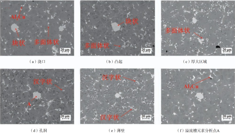 圖10 金相試樣選取位置示意圖、金相圖以及各位置晶粒尺寸分布圖 金屬液在到達鑄件靠近的溢流槽區(qū)域時,溫度有所下降,受最先開始凝固的排氣管道、溢流槽區(qū)域所放出的大量熱量的影響,金屬液凝固較緩慢,晶粒有足夠時間長大并形成圖中較大的α-Al相,如圖10(a)所示。而凸起處,如圖10(f)所示,較早完成充型,結合凝固溫度圖(圖5)顯示,該區(qū)域冷卻速率較高,較早開始凝固,且充型結束時溫度接近液相線,因而過冷度較大,形核率上升,使得晶核間的相互抑制作用增強,抑制了晶粒的長大,最終形成了晶粒尺寸相對較小的球狀或顆粒狀的α-Al相。 厚大區(qū)域金相如圖10(e)所示,本身由于壁厚較大,冷卻緩慢,但合金在凝固過程會受到冷鐵的影響使得冷卻速率增加,從而獲得更大的過冷度,因此凝固后α-Al晶粒尺寸較小。圖10(b)為孔洞區(qū)域金相組織圖,該區(qū)域靠近冷鐵,冷卻速率增大,也獲得了較大的過冷度,在α-Al的形核生長的過程中,Si原子不斷向液相擴散,在凝固前沿出現(xiàn)富集,從而生成了較多的共晶Si。 圖10(c)與圖10(d)分別為薄壁處與澆口處金相組織圖,兩處區(qū)域壁厚較薄,在充型結束后易受到較低的模具溫度的影響加速冷卻,過冷度相對增加,形成尺寸較小的α-Al晶粒。 為進一步探究不同位置的顯微組織結構的區(qū)別,采用掃描電子顯微鏡及電子探針分析了六個區(qū)域的形貌及化學成分,分別如圖11所示。由于薄壁部位壁厚較薄,因而對鑄件該區(qū)域的力學性能以及組織結構有著更高的要求,故對薄壁區(qū)域試樣通過電子探針面掃描分析其元素分布情況,并對其組織結構進行了觀察,如圖12所示。