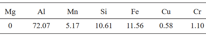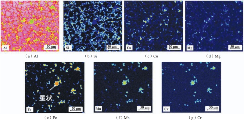 12 EPMA面掃描結果 如圖11和圖12所示,Si元素分布在α-Al基體周圍,Mg元素與Cu元素分布規(guī)律近似,分布在α-Al相周圍的Si基體中,而Fe、Mn和Cr則更多地富集在一起。如圖12所示,Mg的含量較少(如表1所示,加入量在1.0%以下),多分布于共晶Si相與α-Al的交界處,起到細化共晶Si、促進材料內部合金元素擴散、提高材料的力學性能的作用。在合金中還觀察到高密度的較亮化合物(圖11(a)、(f)),它們以細片的形式與α-Al相形成共晶結構,形成Al? Cu相。Al?Cu相以片狀和塊狀顆粒的形式出現(xiàn),研究表明,片狀Al? Cu相較塊狀硬度更高,具有更好的強化效果。 在顯微組織中還能觀察到多種大小不一的相,包括塊狀、多面體狀、漢字狀以及星狀,如圖11以及圖12(e)。根據(jù)圖12元素含量分析判斷,該相含有較多的Fe、Mn、Cr、Al以及Si元素,初步判斷為某種α-Alx(Fe,Mn,Cr)ySiz相,這些第二相是合金中的Fe元素達到一定含量時,而產(chǎn)生的富鐵相。 研究發(fā)現(xiàn),這種富鐵相在鐵含量大于0.6%的鑄件中會被廣泛發(fā)現(xiàn),為α-AlFeMnSi相。根據(jù)EPMA分析,對圖11(d)中的A點進行成分分析得到結果如表6,確定其成分為Al??(Fe,Mn,Cr)? Si?。此外,凝固環(huán)境,特別是冷卻速率的變化對該富鐵相凝固過程的影響較大。隨著冷卻速率的增加,富鐵相的大小和體積分數(shù)減小。而當添加了足夠的Mn,即當Mn/Fe比例大于0.5,且Fe含量小于1.2%時,有利于含鐵相轉變?yōu)?alpha;-Fe相,減少針狀β-Fe的形成,改善合金的延展性。Cr元素的加入,促進了塊狀、星狀富鐵相的形成。星狀和塊狀富鐵相的硬度遠高于Al基體,漢字狀的硬度略低于塊狀、星狀富鐵相的硬度。因此,這些塊狀、星狀富鐵相的出現(xiàn)有助于提高材料的硬度。綜合金相圖和SEM觀察,鑄件中未發(fā)現(xiàn)β-Fe相,α-Fe相在Mn和Cr的影響下更多地轉變?yōu)橛欣谔嵘T件性能的塊狀和星狀富鐵相,其性能更好。而在性能要求較高的薄壁區(qū)域,鑄件整體組織、析出相分布也更加均勻。
