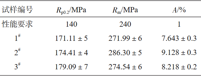 表6 A點EPMA分析各元素原子百分比 at.% 鑄件的力學性能測試結果如圖13以及表7所示,其中1 #、2 #與3 #數(shù)據(jù)分別為溢流槽區(qū)域、底部厚大區(qū)域以及澆口區(qū)域各取三個試樣獲得的平均值,根據(jù)表中數(shù)據(jù)顯示,鑄件整體的力學性能優(yōu)異,各指標均滿足并高于鑄件技術要求。因而綜合鑄件微觀組織與力學性能測試可以判斷該工藝下的鑄件有著均勻的微觀組織與良好的力學性能。