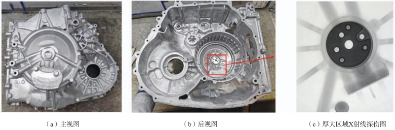 表7 優(yōu)化后鑄件力學性能測試結果 通過實際生產(chǎn)試制,如圖14(a)和(b)所示,以及對出現(xiàn)缺陷風險較高的底部厚大區(qū)域進行X射線探傷檢測,如圖14(c)所示,可以確定得到了表面質量良好且無明顯的縮松、孔洞等缺陷的變速器殼體。因而綜合鑄件微觀組織觀察、力學性能測試以及實際生產(chǎn)驗證可以判斷,在該壓鑄工藝參數(shù)下得到的鑄件有著良好的表面質量與工藝性能