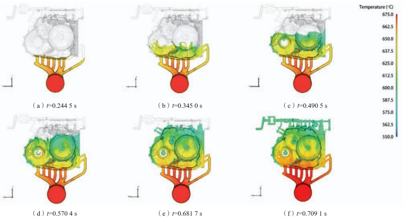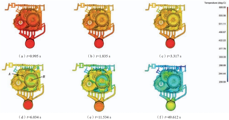 圖4 真空壓鑄鋁合金殼體的充型過程 圖5為真空壓鑄鋁合金殼體的凝固過程。鑄件的凝固趨勢沿重力方向形成一定溫度梯度,整體自排氣管道而下向澆口部位凝固,基本符合順序凝固的過程。在鑄件凝固時間t=6.034 s時,如圖5(d)所示,鑄件左上部存在著凸起(A),該形狀更易受較低的模具溫度的影響較早開始冷卻凝固,影響鑄件整體凝固順序,還可能會導致鑄件其余部位在凝固時缺少金屬液的補縮而出現(xiàn)縮松縮孔等缺陷。此外殼體底部的厚大區(qū)域(B)由于較大的壁厚,導致該區(qū)域冷卻速度較慢,溫度較高,此時周圍合金已經(jīng)開始凝固,這會導致該處的凝固收縮無法得到金屬液補縮,形成了孤立液相區(qū),產(chǎn)生熱應力,出現(xiàn)縮松縮孔等缺陷,影響該區(qū)域的微觀組織結構和力學性能。