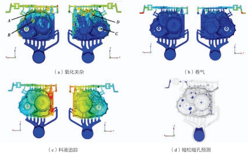 圖5 真空壓鑄鋁合金殼體的凝固過程 2.2 缺陷分析 圖6為缺陷分析。如圖6(a)、(b)所示,在充型過程中,溢流槽A與C、凸起B(yǎng)以及孔洞C極易出現(xiàn)氧化夾雜缺陷,且存在一定的卷氣風險。圖6(c)顯示了充型時不同澆口料液的流向,圖6(d)為縮松和縮孔缺陷預測。綜合圖6所示的各項缺陷分析可以發(fā)現(xiàn),易產(chǎn)生缺陷風險的位置多為不同股的料液交匯處,因此壓射比壓以及壓射速度將會是影響最終成品質量的重要因素。