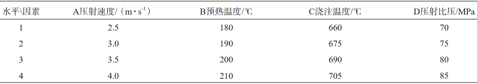 圖6 缺陷分析 2.3 正交試驗 基于章節(jié)2.1與章節(jié)2.2的分析,并結合實際生產(chǎn)經(jīng)驗,選取四個對鑄件質量有重要影響的壓鑄工藝參數(shù)進行正交試驗,分別為:壓射速度(A)、模具預熱溫度(B)、合金液澆注溫度(C)以及壓射比壓(D),建立正交試驗因素水平表及試驗方案,如表3所示。
