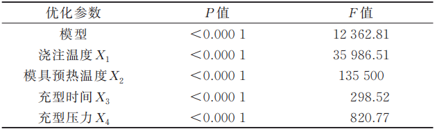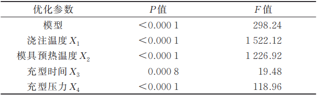 根據上述27組數值模擬結果得到的關于響應指標的響應面模型擬合參數見表5。通過這些參數可以確定擬合度最高的響應面模型。根據擬合參數確定響應指標的響應面模型為二階響應面模型。表5中的P值、R2和R2adj都是用來判斷響應面模型與模擬數據的擬合程度。當P值小于0.05時,可認為響應面模型與模擬數據之間的誤差較小。R2為多重判定系數,當R2≥0.8時,可認為該響應面模型可用,R2越接近1,響應面模型的擬合度越高。R2adj為調整后的多重判定系數,通常作為最終判定系數。C.V.為變異系數,若該值大于15%,則需要考慮是否存在異常數據。從表5中可以看出,二階響應面模型與模擬數據擬合度較好,可以用該模型繼續進行響應面試驗。 孔隙體積的顯著性分析見表6。表6中的P值反映了各優化參數對響應指標的影響顯著性。當P值小于0.05時,表示該參數對響應指標影響顯著;當P值小于0.01時,表示該參數對響應指標影響高度顯著。F值反映了各優化參數對響應指標的影響程度,F值越大,則影響程度越大。從表6中可知,4個優化參數對孔隙體積的影響都是高度顯著,其中澆注溫度與模具預熱溫度的影響程度最大。孔隙體積的雙因素交互作用三維響應面圖見圖5。 表5 二階響應面模型擬合參數