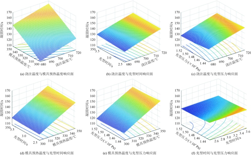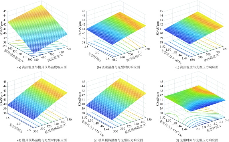 圖5 孔隙體積的雙因素交互作用三維響應面圖 SDAS的顯著性分析見表7。從表7中可知,充型時間和充型壓力對SDAS的影響程度低于澆注溫度和模具預熱溫度。SDAS的雙因素交互作用三維響應面圖見圖6。凝固時間的顯著性分析見表8。從表8中可知,模具預熱溫度的影響程度最大,澆注溫度次之,充型時間的影響程度最小。凝固時間的雙因素交互作用三維響應面圖見圖7??梢钥闯?,溫度對凝固時間的影響最顯著,澆注溫度和模具預熱溫度越高,凝固時間越長。而當充型時間越長或充型壓力越小時,凝固時間隨之增加;當充型時間越短或充型壓力越大時,凝固時間隨之增大。 表7 SDAS的顯著性分析