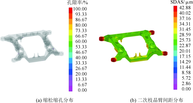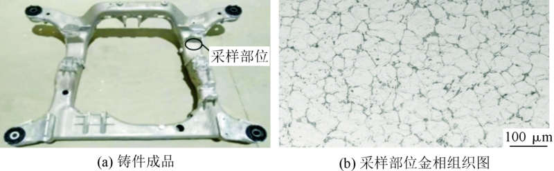 圖8 鑄件成品及金相組織圖 結論 (1)由響應面法分析可知,對于孔隙體積而言,澆注溫度、模具預熱溫度、充型時間和充型壓力過高或過低都會導致孔隙體積增加;對于SDAS而言,澆注溫度和模具預熱溫度對其影響程度較大,會隨著澆注溫度和模具預熱溫度的升高而增加;對于凝固時間而言,其會隨著澆注溫度,模具預熱溫度和充型時間的增加而增加,隨著充型壓力的增加而減小。 (2)根據響應面法得到的優化目標函數,并通過遺傳算法尋找最優參數組合。計算后得到的優化后的參數組合是澆注溫度為707.89 ℃,模具預熱溫度為329.61 ℃,充型時間為3.06 s,充型壓力為14 822.30 Pa。相比于初始方案,孔隙體積減少了51%,鑄件質量明顯提高。SDAS和凝固時間也略有減少。對優化方案進行生產試制并進行采樣試驗,驗證了鑄件質量符合使用要求,證明了該優化方案的可行性。 《A356鋁合金后副車架低壓鑄造工藝參數的設計與優化》