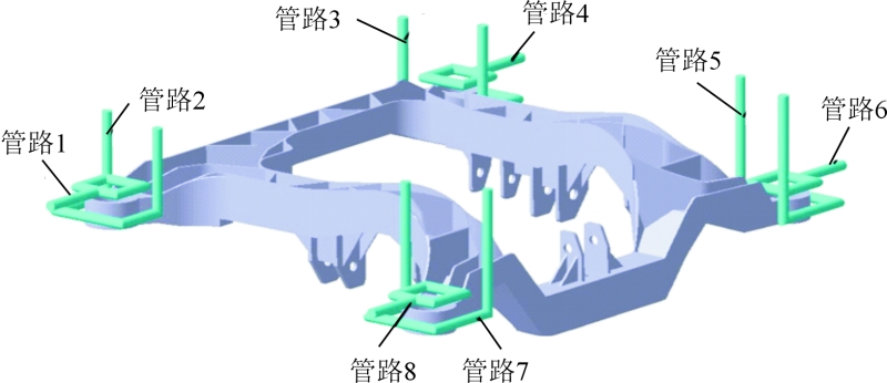 研究對象為某A356鋁合金后副車架,其結構見圖1。該鋁合金后副車架為大型薄壁件,外形尺寸為1 156 mm×873 mm×306 mm,平均壁厚為4 mm,最小壁厚為3 mm,最大壁厚為11.7 mm,質量為16.88 kg。