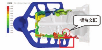 圖2 局部厚大位置剖視圖 由于該油底殼內(nèi)腔為產(chǎn)品頂出位置,因此內(nèi)腔以動(dòng)模成形,方便產(chǎn)品頂出,減小包緊力的作用,從而保證產(chǎn)品的平面度;且濾清器安裝面、放油螺栓孔及后端面為3組滑塊所在位置,如圖1(b)。故依據(jù)該油底殼結(jié)構(gòu)選定分型及進(jìn)料方式如圖3所示:整體進(jìn)料方式為豎直進(jìn)料,以油底殼前端面為進(jìn)料位置,可以避免分流錐設(shè)置在滑塊上容易卡死的風(fēng)險(xiǎn)。共設(shè)計(jì)10組內(nèi)澆道進(jìn)料,后端面為填充末端。對(duì)該澆注系統(tǒng)進(jìn)行初始數(shù)值模擬,模擬結(jié)果顯示,鑄件充型完成時(shí)整體溫度偏低,如圖4所示。原因?yàn)闈沧⑾到y(tǒng)流程長(zhǎng),充型過(guò)程中熱量損失大,充型末端容易形成冷料聚集,從而導(dǎo)致加工后氣孔、夾渣缺陷增多。且底部?jī)晒闪鞯纼?yōu)先進(jìn)料,容易形成冷隔,導(dǎo)致拋丸后起皮,如圖5所示。