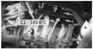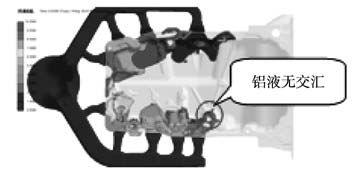 圖8 油底殼缺陷解剖圖 高壓油道孔泄漏問(wèn)題為內(nèi)部縮孔導(dǎo)致,部分泄漏產(chǎn)品縮孔外露導(dǎo)致裂紋產(chǎn)生,油道位置為產(chǎn)品熱節(jié)所在,油道鑄銷高壓點(diǎn)冷無(wú)法完全冷卻該位置,使用熱成像儀對(duì)該位置模具溫度進(jìn)行檢測(cè),油道鑄銷位置整體溫度近290 ℃,如圖9所示。通過(guò)調(diào)整鑄銷高壓點(diǎn)冷通水流量,延長(zhǎng)通水時(shí)間,無(wú)明顯改善效果,初步判斷存在其他影響因素。通過(guò)反復(fù)確認(rèn)CAE模擬結(jié)果,發(fā)現(xiàn)油道鑄銷正處于操作側(cè)末端兩股流道交匯處,如圖10所示,兩股流道直沖油道鑄銷且融合不良,從而導(dǎo)致鑄銷溫度過(guò)高產(chǎn)生縮孔甚至縮孔外露。