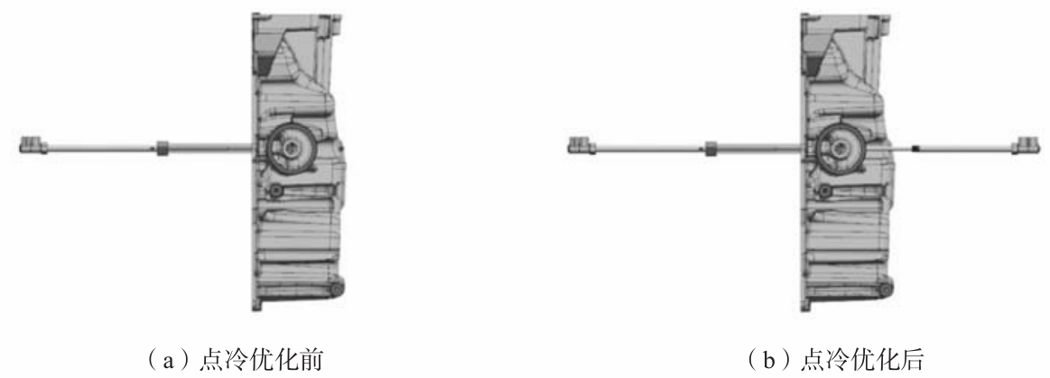 圖11 改善后模具溫度場(chǎng) 依據(jù)缺陷所在對(duì)模具進(jìn)行優(yōu)化調(diào)整,將操作側(cè)最末端一股流道進(jìn)行封堵,如圖12所示,同時(shí),在定模芯新增一組高壓點(diǎn)冷對(duì)高壓油道孔底部壁厚位置進(jìn)行點(diǎn)冷,加強(qiáng)熱節(jié)位置的冷卻,如圖13所示。