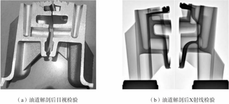 表1 壓鑄工藝參數(shù) 04 壓鑄過(guò)程中的缺陷及工藝優(yōu)化 在小批量壓鑄生產(chǎn)過(guò)程中,主要存在如圖8所示問(wèn)題:高壓油道孔(不加工)泄漏,料廢占比30%,且部分泄漏產(chǎn)品孔內(nèi)目視可見(jiàn)裂紋存在。
