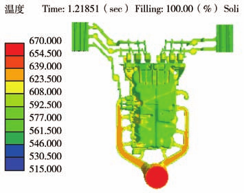圖7 壓室充型模擬結(jié)果 依據(jù)模擬結(jié)果顯示,鋁合金液在壓室內(nèi)溫度始終保持在液相線+30 ℃以上,且低速充型過(guò)程中,隨著沖頭向前推進(jìn),鋁液充型平穩(wěn),無(wú)卷氣現(xiàn)象產(chǎn)生,避免了壓室內(nèi)氣體的卷入。 3.2 快壓射速度的選擇 快壓射速度選擇的原則:(1)鋁合金液在充滿型腔前必須具有良好的流動(dòng)性,保證充型的順暢;(2)使鋁合金液能快速有序地充滿型腔,并把氣體排出到型腔外;(3)不形成高速的金屬流沖刷型腔或型芯,避免粘模現(xiàn)象的產(chǎn)生,鋁合金壓鑄件內(nèi)澆道速度一般為40~60 m/s。油底殼鑄件內(nèi)澆道總截面積為771mm²,壓室截面積為9498.5mm²,初步選定內(nèi)澆道速度為50m/s ,依據(jù)伯努利方程:內(nèi)澆道速度×內(nèi)澆道截面積=高速速度×壓室截面積,計(jì)算得出高速速度為4m/s。 3.3 高速切換位置的選擇 壓鑄件理論高速切換位置為金屬液填充至內(nèi)澆道位置,該油底殼鑄件理論高速位置為590 mm,但由于內(nèi)澆道為上下排列,底部的內(nèi)澆道會(huì)提早進(jìn)料,導(dǎo)致鑄件底部位置出現(xiàn)冷隔問(wèn)題,故將高速切換點(diǎn)設(shè)置為550 mm,具體壓鑄工藝參數(shù)見(jiàn)表1。