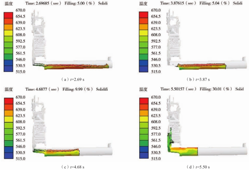 圖5 充型過(guò)程示意圖 底部及兩側(cè)流程過(guò)長(zhǎng),鋁液在流道內(nèi)熱量損失的問(wèn)題可以通過(guò)適當(dāng)提高內(nèi)澆道的充型速度,從而提高鋁液進(jìn)入型腔的溫度,依據(jù)公式(1):