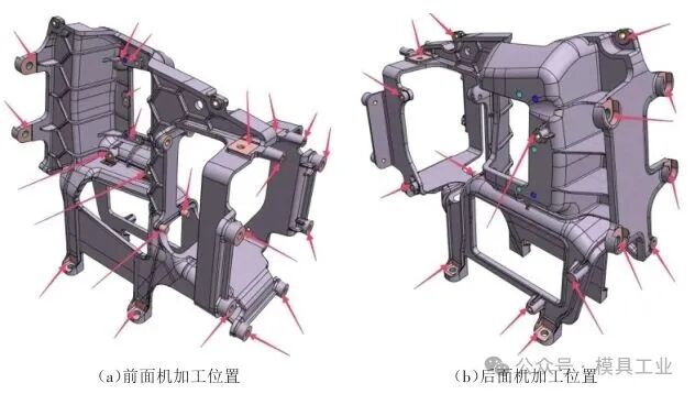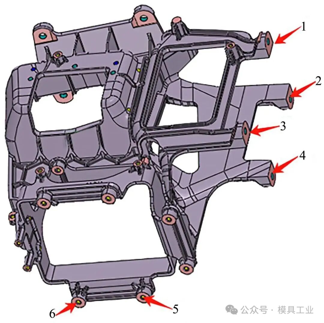 圖2 鑄件加工余量 2 成型分析 2.1 難點分析 鑄件成型難點:①籠式結構復雜,錯綜復雜的加強筋影響熔體流向,解決熔體對沖時困氣問題,要求精準控制流道流量及合理設計溢流槽和排氣槽;②鑄件壁厚差異較大,型腔末端充填困難;③鑄件末端有6處安裝孔位,如圖3所示,需保證鑄件內部的致密性,無氣孔、縮孔等缺陷,這樣才能滿足主機支架的安裝強度要求。