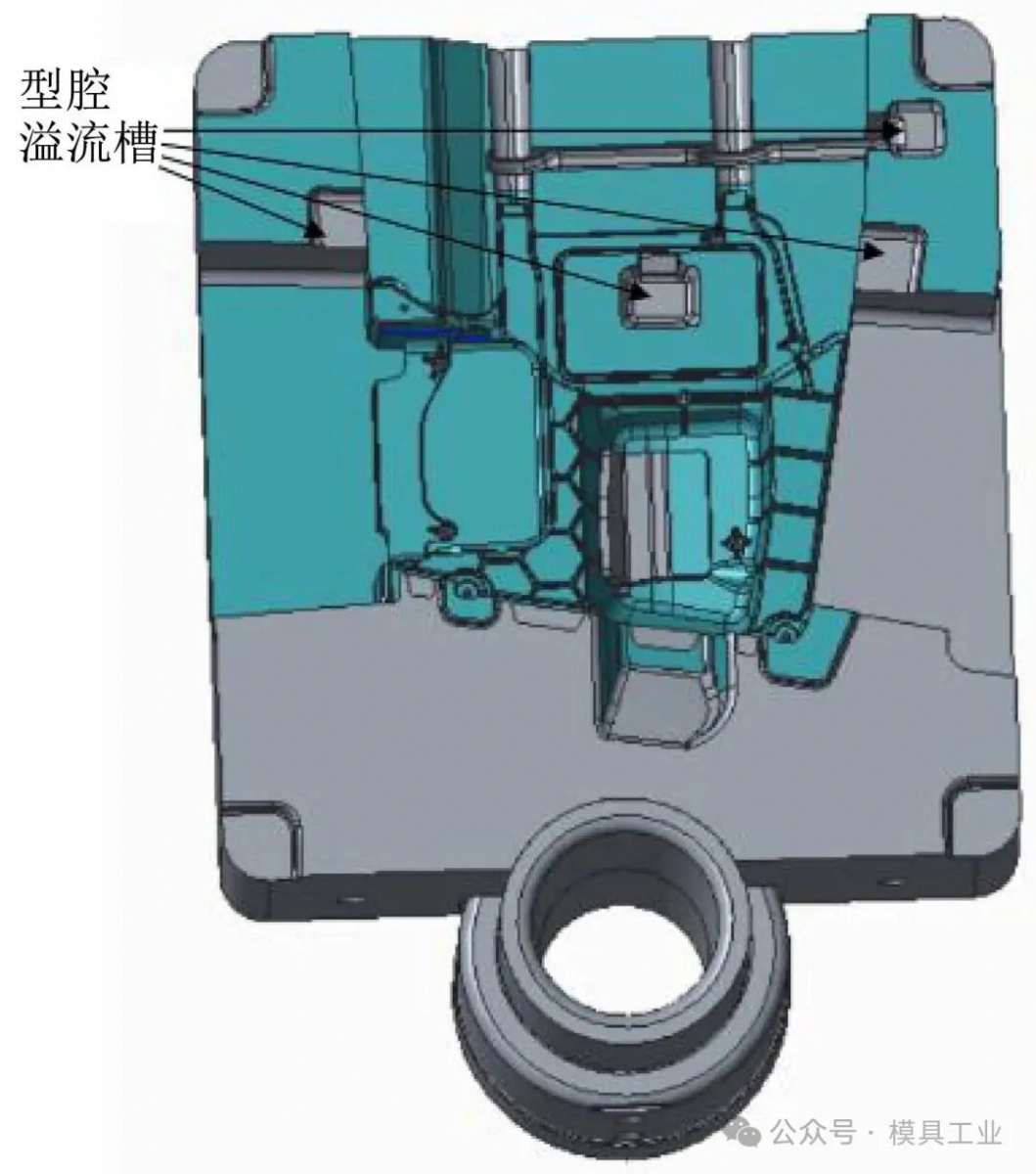 圖5 澆注系統設計 針對4股流道進料及鑄件籠式加強筋結構易引起多股料流在交匯處產生冷料的問題,如不能及時將冷料排出型腔,會導致鑄件表面產生冷隔紋,內部引起縮孔、困氣等,甚至影響其強度導致斷裂,因此在型芯側設計了4個25 mm×25 mm×12 mm溢流槽和4個12 mm×0.1 mm排氣槽,如圖6所示。在型腔頂部加強筋內側設計了25 mm×25 mm×5 mm溢流槽,其側壁脫模斜度為30°,底部倒R3 mm圓角,靠溢流槽內澆口帶出成型鑄件,為了順利帶出成型鑄件,內澆口尺寸設計為20 mm×1 mm,用于及時排出流道2、3交匯的冷料。在型芯對應的型腔板位置也開設相應的溢流槽以增加排渣的容量,如圖7所示。