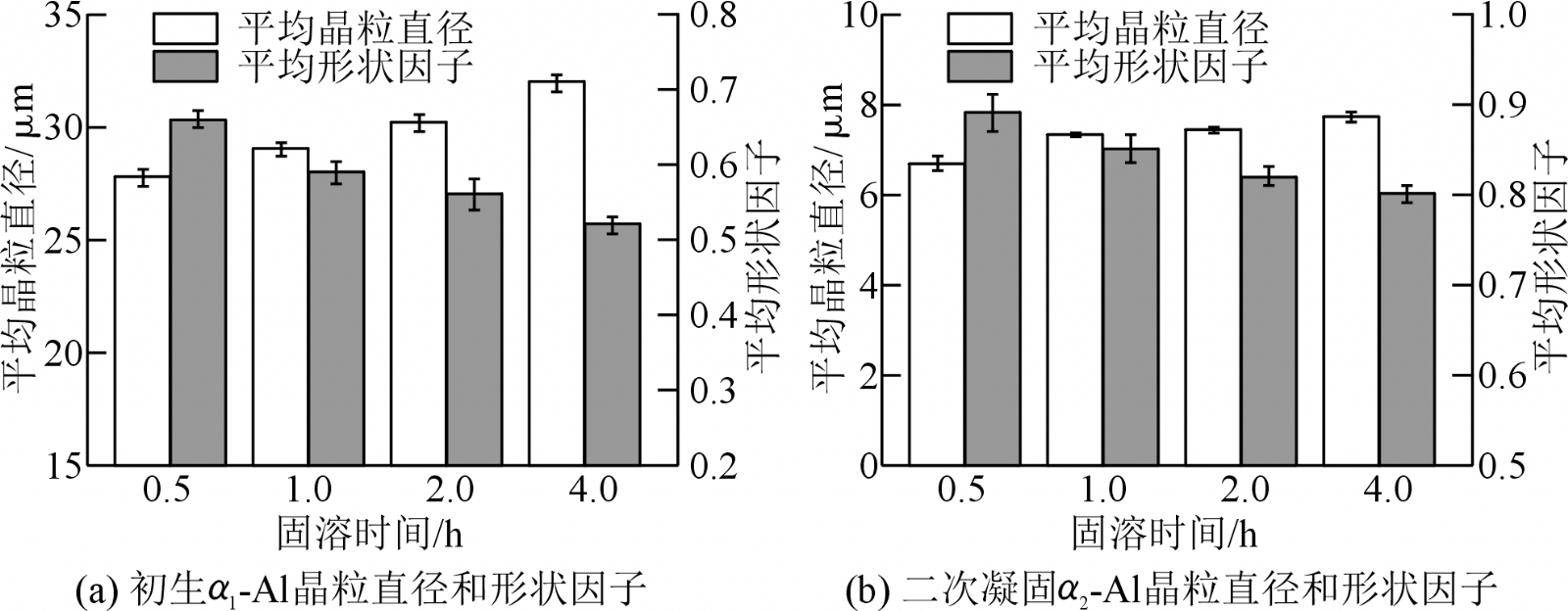 圖1為半固態壓鑄Al-Si-Fe-Mg合金的顯微組織、EDS分析、EPMA組織及Fe含量。 圖2為不同固溶時間處理的半固態壓鑄Al-Si-Fe-Mg合金的EBSD組織。可以看出,不同固溶時間處理的合金組織中的α-Al晶粒均由大尺寸的初生α1-Al晶粒和小尺寸的二次凝固α2-Al晶粒組成。基于EBSD結果,對初生α1-Al晶粒和二次凝固α2-Al晶粒的直徑和形狀因子進行統計,見圖3。