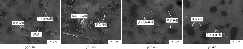 圖4 不同固溶時間下半固態壓鑄Al-Si-Fe-Mg合金的SEM組織