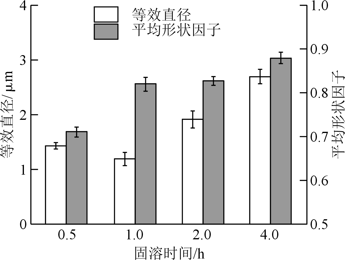 圖3 固溶時間對半固態壓鑄Al-Si-Fe-Mg合金顯微組織的影響 圖4為固溶處理后半固態壓鑄Al-Si-Fe-Mg合金的SEM組織。可以看出,當固溶時間為0.5 h時,共晶Si相由短棒狀以及顆粒狀共晶Si相組成,共晶Si相出現頸縮現象,頸縮的共晶Si相發生溶斷并破碎成小的共晶Si相,見圖4a。當固溶時間增加至1 h時,共晶Si相為顆粒狀形貌,見圖4b。隨著固溶時間繼續增加,顆粒狀共晶Si相長大,見圖4c和圖4d。對比共晶Si相的等效直徑和形狀因子發現,當固溶時間從0.5 h增加至4 h時,共晶Si相的等效直徑先減小后增加,形狀因子持續增大,見圖5。