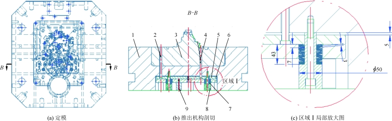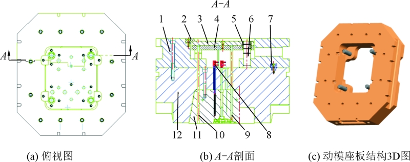 圖7 碟簧結構示意圖 動模推出機構的組成主要由推出元件、復位元件、導向元件、限位元件及結構元件,通常動模推出機構的結構組成見圖8。圖8a中推出機構的動模座板為平板結構,限位釘固定在動模座板上;圖8b中推出機構的動模座板為臺階式,與支板合為一體,同時內部臺階起到推出機構的限位作用。這兩種結構存在一個共性問題,就是當需要更換推桿或動模冷卻水等易損件時,必須拆卸動模座板。尤其是大型模具體積和質量大,并且連接螺栓尺寸大,拆卸動模座板的過程費時費力,嚴重影響生產效率。因此在復制模具時對動模推出機構進行優化。 離合器殼體動模推出機構的結構優化方案見圖9,動模座板采用一體式結構,裝配時首先將推板導柱安裝在動模座板的內臺階面上,推板導柱共4件分布在動模套板內腔四角處;定位銷安裝在動模座板與動模套板的結合面上。然后將帶有推板導柱和定位銷的動模座板安裝到動模套板上,用螺栓固定連接。之后將推桿、復位桿、推板導套按順序安裝在推板上,再用螺栓與推板固定為推出組件,將推出組件安裝到動模座板中;最后固定4個壓蓋式限位塊。維修維護更換易損件時,只需將4個小限位塊拆下,即可將帶推桿的推出組件取出,方便、安全、可靠。