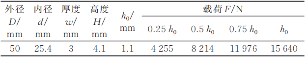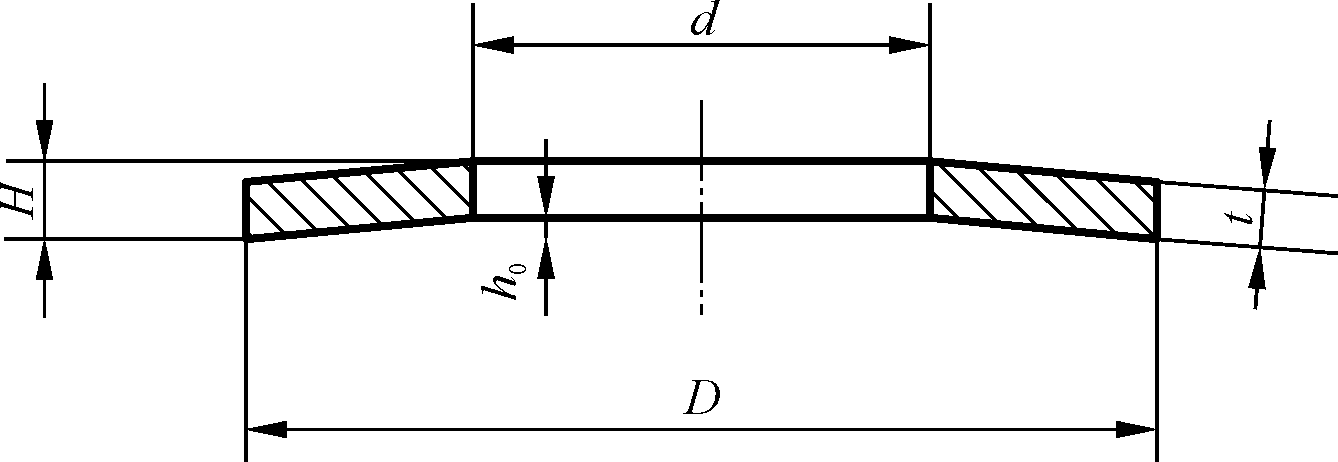 圖6 定模推出機構結構組成圖 從圖6b可以看出,定模鑲塊在中心成形區域為圓形臺階過渡形狀,主要由6部分凸臺組成,分別計算每部分的推出力,計算結果見表1。定模型芯總推出力∑F推=42 393 N。 碟簧具有體積小、負荷大、組合使用方便等特性,可以根據使用空間、負荷、行程等不同需求,通過單片對合組合、多片疊合組合等方式獲取不同的載荷和行程。在本模具定模推出機構中使用碟簧,可以在保證足夠的推出力的情況下有效地減小安裝空間,保證定模套板的強度。 依據本模具的定模推出結構,共設計兩處安裝碟簧的位置,處于定模推出機構縱向水平橫向中心對稱位置,見圖5,根據所需推出力,選用外徑為?50 mm,厚度為3 mm的碟簧兩片并聯使用。為滿足推出距離,選用6組串聯組合。選用的碟簧參數見表2。碟簧結構示意圖見圖7。 表1 定模型芯推出力