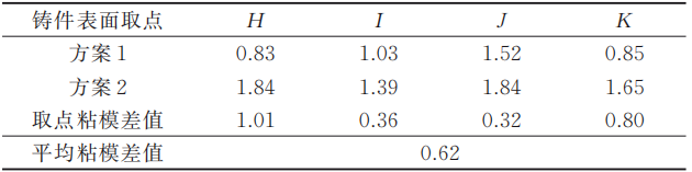 圖6為兩個方案的熱節(jié)模擬對比圖,表2為兩個方案的取點熱節(jié)對比數(shù)據(jù)表。從仿真顯示的鑄件凝固的熱節(jié)分析,通過風(fēng)險位置附近的取點測量可知使用方案1比方案2的鑲件熱節(jié)數(shù)值低,熱節(jié)數(shù)據(jù)差值平均低約0.22 s,因熱節(jié)引起的縮孔風(fēng)險降低。 圖7為兩個方案的燒傷粘模對比圖,表3為取點燒傷粘模對比數(shù)據(jù)表。從鑄件凝固的燒傷粘模分析,通過風(fēng)險位置取點測量可知使用方案1比方案2的鑲件燒傷粘模數(shù)值低,燒傷粘模數(shù)據(jù)平均低約0.62 s,因燒傷粘模引起的風(fēng)險降低。
