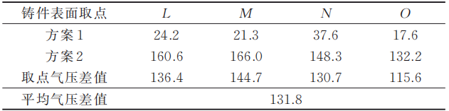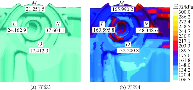 在采用冷卻效果比較好且能解決連接濾清器位置局部燒傷缺陷的金屬3D打印隨形冷卻鑲件的方案基礎(chǔ)上,在Magma模擬軟件中增加兩個邊界條件,即抽真空與常規(guī)大氣排氣,再通過模擬結(jié)果對比來驗證抽真空工藝與常規(guī)大氣排氣對濾清器安裝面氣孔的影響,從而得出優(yōu)化解決兩個缺陷的組合方案。 從模擬結(jié)果分析,根據(jù)鑄件的填充氣壓對比,通過對濾清器安裝面的取點測量可知使用方案3抽真空工藝比使用方案4大氣排氣的氣壓數(shù)值低,氣壓數(shù)值平均低約131.8 kPa,因高氣壓引起的氣孔外露風(fēng)險降低。圖8為兩個方案的氣壓模擬對比圖,表4為兩個方案的取點氣壓對比數(shù)據(jù)表。方案3為抽真空排氣模擬,方案4為常規(guī)大氣排氣模擬。
