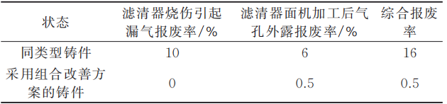 綜上,通過Magma軟件的模擬結(jié)果對比可知,采用高真空工藝比采用常規(guī)大氣排氣工藝時濾清器安裝面的氣壓數(shù)值低,對改善氣孔缺陷效果明顯。同時,采用金屬3D打印隨形冷卻鑲件和抽真空工藝結(jié)合是解決鑄件連接濾清器局部燒傷及濾清器連接面機加工后出現(xiàn)氣孔外露缺陷的理想組合方案。 在壓鑄生產(chǎn)過程中,針對鑄件連接濾清器的成形位置,決定采用高碳高合金鋼W360為金屬3D打印隨形冷卻鑲件代替?zhèn)鹘y(tǒng)的8418材料的直冷鑲件,冷卻效果得到很好的改善,使用壽命也比傳統(tǒng)的8418材料長。為提高模具抽氣效果,增強模具的密封性能,在定模模芯與模架分型處開一條密封槽,并在密封槽內(nèi)加裝耐高溫密封圈;動模墊板后面增設(shè)一塊可固定在動模墊板上的密封板,并在密封板上開設(shè)了密封槽及緩沖氣槽。 使用3D金屬打印技術(shù)制造的隨形冷卻的鑲件與抽真空工藝結(jié)合進行壓鑄試制,該鑄件連接濾清器的部位的角位燒傷引起的漏氣報廢率跟同類型鑄件相比由原來的10%變?yōu)?%,加工面氣孔外露的報廢率跟同類型鑄件相比由原來的6%變?yōu)?.5%,綜合報廢率跟同類型鑄件相比由原來的16%變?yōu)?.5%,完全符合客戶的使用要求。表5為報廢率對比,圖9為連接濾清器位置實物圖。 表5 報廢率對比