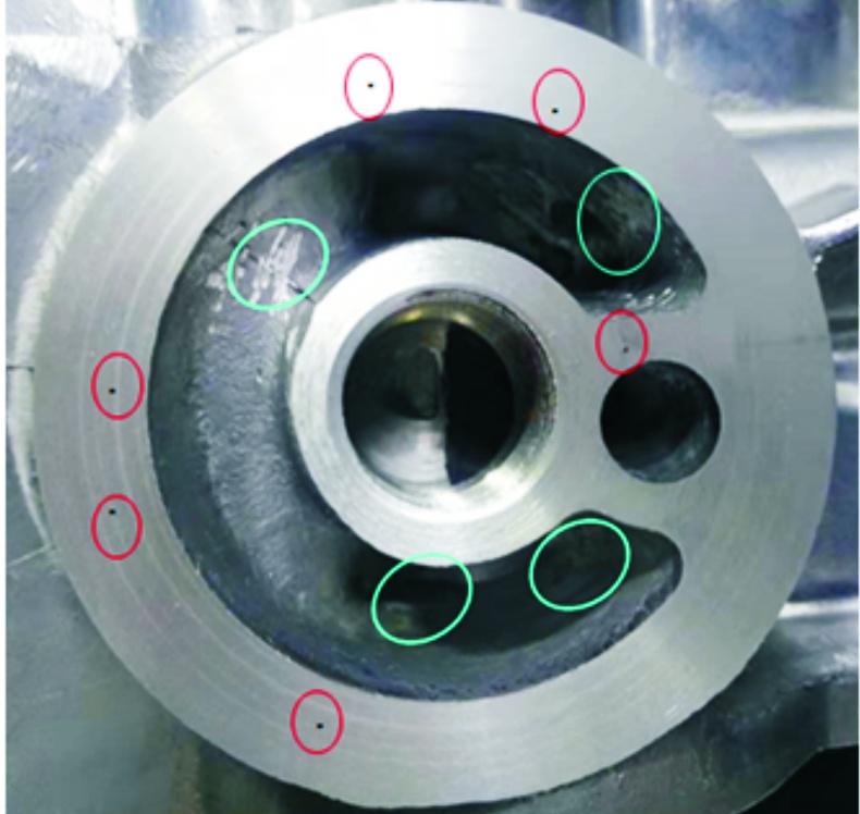 圖1 鋁合金曲軸箱壓鑄方案示意圖 圖2為鑄件連接濾清器局部位置圖。根據(jù)初步分析,該鑄件連接濾清器的部位結(jié)構(gòu)較復(fù)雜,紅色區(qū)域(基于原圖為彩色描述,下同)較深且狹小(深26 mm,寬7 mm)。該位置的模具鑲件用傳統(tǒng)技術(shù)加工出來的冷卻水道不能深入底部并環(huán)繞一周,冷卻效果差,造成紅圈區(qū)域燒傷嚴重并且漏氣。同類型鑄件不僅在該位置的燒傷比較嚴重,而且有機加工后出現(xiàn)氣孔外露的現(xiàn)象。圖3為同類型鑄件的缺陷圖所示,紅圈為氣孔缺陷,藍圈為燒傷缺陷。因此如何提高該區(qū)域的冷卻效率及減少氣孔是整個壓鑄工藝設(shè)計的難點。