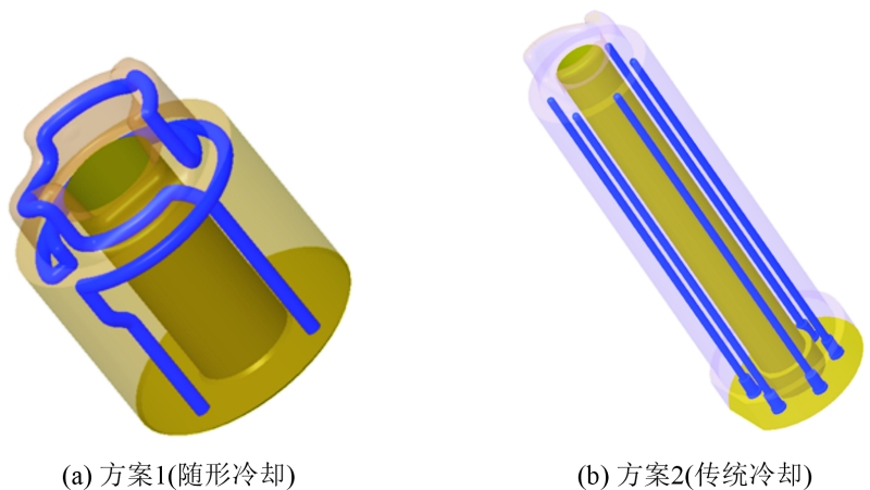 圖4 隨形冷卻鑲件與傳統(tǒng)冷卻鑲件圖