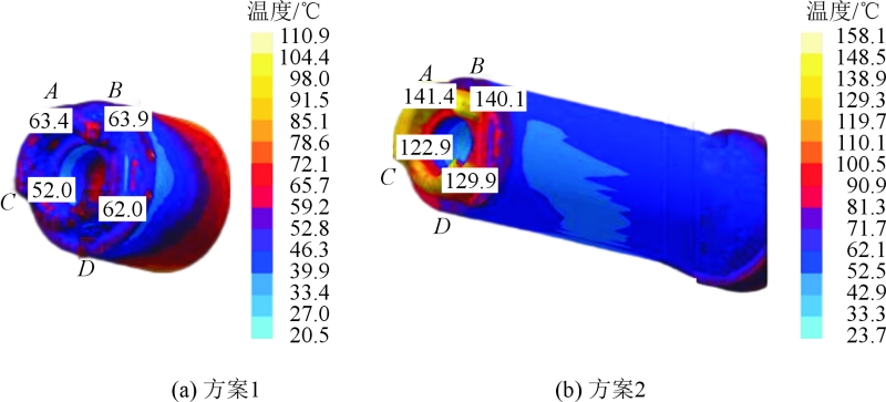 圖3 同類型鑄件的缺陷圖 同類型鑄件連接濾清器局部燒傷缺陷是模具的熱量過高導(dǎo)致,而安裝面的氣孔缺陷是鋁液內(nèi)含氣量過高造成,兩種缺陷造成的因素相互獨立,所以先用Magma軟件模擬金屬3D打印隨形冷卻鑲件和傳統(tǒng)冷卻鑲件對燒傷缺陷的影響效果,然后在冷卻效果比較好的能解決濾清器局部燒傷缺陷的鑲件基礎(chǔ)上再做一個抽真空與否的模擬對比,從而得出最優(yōu)的解決缺陷的組合方案。 初步確定采用金屬3D打印工藝制造隨形冷卻水道的鑲件,提高冷卻效率以解決燒傷缺陷。為了保證設(shè)計的有效性,使用CAD設(shè)計了兩套方案。圖4為隨形冷卻鑲件與傳統(tǒng)冷卻鑲件圖,藍色為冷卻水道。在Magma模擬軟件導(dǎo)入兩種鑲件的壓鑄方案進行模擬仿真。通過模擬結(jié)果對比,分析兩種方案對風(fēng)險位置的影響,從而判定金屬3D打印隨形冷卻鑲件的方案對解決鑄件連接濾清器局部的燒傷缺陷是否可行。圖5為兩個方案的鑲件溫度模擬對比圖,表1為兩個方案的鑲件取點溫度對比數(shù)據(jù)表。從仿真軟件顯示的鑲件溫度分析,鋁液在型腔100%填充后,通過鑲件成形位置的取點測量可知方案1比方案2的溫度低,溫度數(shù)據(jù)差值平均低約73.3 ℃。