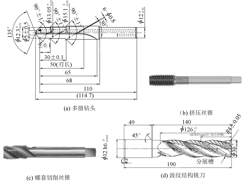 圖10 前艙鑄件的機(jī)加工刀具形式 通過加工試驗(yàn)并檢測,雙梁雙主軸五軸龍門加工中心、機(jī)器人切削單元在加工的鑄件孔、螺紋等特征外觀質(zhì)量符合標(biāo)準(zhǔn)要求,見圖11。但在加工鑄件的面上,單梁單主軸五軸龍門加工中心方案與雙梁雙主軸五軸龍門加工中心方案,加工前艙鑄件外觀以及尺寸精確均達(dá)到了標(biāo)準(zhǔn)要求,而采用機(jī)器人切削單元設(shè)備方案加工所得到的加工面外觀卻存在著明顯的起級以及振紋。這主要是由于該方案中的主軸剛性相對較差,使得機(jī)器人在進(jìn)行端面加工的過程中,無法保持穩(wěn)定的切削狀態(tài),從而產(chǎn)生刀紋以及振紋,嚴(yán)重影響了加工件的質(zhì)量。