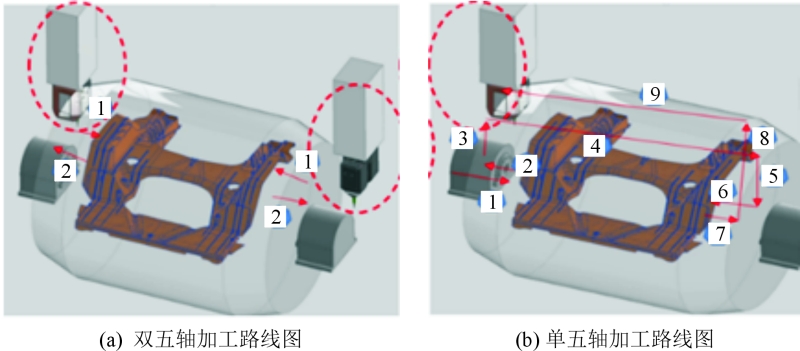 圖1 一體化前艙壓鑄件 為了應(yīng)對這種多角度加工的挑戰(zhàn),同時考慮到多工序生產(chǎn)可能帶來的高風(fēng)險,包括工序銜接的誤差累積、生產(chǎn)時間的延長以及設(shè)備故障率的增加等因素,經(jīng)過綜合評估與分析,最終采用通過一道工序來完成前艙所有特征的加工方案。其優(yōu)勢在于:①裝夾次數(shù)大幅減少,減少了因多次裝夾可能帶來的定位誤差,提升了鑄件尺寸的穩(wěn)定性。同時,產(chǎn)品因多次搬運(yùn)而導(dǎo)致的劃碰傷風(fēng)險也顯著降低,保障了產(chǎn)品的外觀質(zhì)量。整個加工過程可以在一道工序內(nèi)完成,機(jī)械手抓取和放置動作減少,這不僅使得上下料過程更加方便快捷,還降低了對自動化設(shè)備復(fù)雜性的要求,從而有效控制成本;②設(shè)備獨(dú)立作業(yè),故障影響小。每臺加工設(shè)備負(fù)責(zé)完成特定的加工任務(wù),減少了因某一設(shè)備故障而導(dǎo)致整條生產(chǎn)線停工的風(fēng)險。此外,設(shè)備調(diào)試和故障處理的時間也被最小化,對整線產(chǎn)能的影響微乎其微;③工序精簡,轉(zhuǎn)型切換迅速。由于加工過程被高度整合,工序間的轉(zhuǎn)型切換變得簡單快捷,大大縮短了生產(chǎn)周期,提高了整體的生產(chǎn)效率;④綜合效益顯著,在搬運(yùn)、效率、質(zhì)量、成本等多個方面,該方案對前艙壓鑄件的生產(chǎn)線都展現(xiàn)出了明顯的優(yōu)勢。簡化了生產(chǎn)流程,降低了生產(chǎn)成本,同時更利于現(xiàn)場的布局管理和過程質(zhì)量的嚴(yán)格管控,為企業(yè)的精益生產(chǎn)和持續(xù)改進(jìn)奠定了堅實(shí)的基礎(chǔ)。 在具體的加工工藝過程中,該方案加工順序?yàn)椋菏紫冗M(jìn)行基準(zhǔn)孔和基準(zhǔn)面的加工,隨后加工其他光孔,確保孔位的準(zhǔn)確性和孔壁的光潔度;最后進(jìn)行其他面及螺紋孔的加工,完成整個前艙的加工。 按照上述方案的加工工藝路線,結(jié)合到產(chǎn)品加工擺放角度多的特點(diǎn),設(shè)備必須具備五軸或五軸以上加工功能。此外,產(chǎn)品的尺寸巨大,對應(yīng)的夾具質(zhì)量大,立式龍門式設(shè)備相比臥式設(shè)備剛性更好。結(jié)合上述分析,目前有2種五軸設(shè)備選型方案: (1) 五軸龍門加工中心設(shè)備方案 此方案的核心在于設(shè)備采用業(yè)內(nèi)常規(guī)且成熟的龍門五軸加工中心形式,此類設(shè)備加工工藝成熟、穩(wěn)定、可靠,但此類設(shè)備價格高、制造周期長。目前此方案有2種形式可供選擇:單梁單主軸式(以下簡稱單五軸)和雙梁雙主軸式(以下簡稱雙五軸),兩者的區(qū)別在于主軸加工頭的數(shù)量,具體結(jié)構(gòu)見圖2。