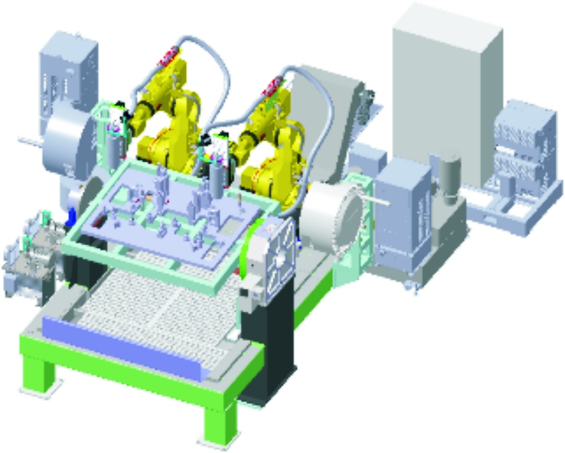 圖2 龍門五軸加工中心的形式及加工路線圖(數(shù)字為主軸沿著箭頭路線移動的順序) (2)機(jī)器人切削加工單元方案 此方案的創(chuàng)新之處在于通過機(jī)器人手爪配置主軸系統(tǒng)來抓取刀具對產(chǎn)品進(jìn)行切削加工,并使用2個機(jī)器人手爪完成銑削等作業(yè),見圖3。其優(yōu)勢主要體現(xiàn)在設(shè)備價格相對較低、柔性好以及制造周期短等方面。