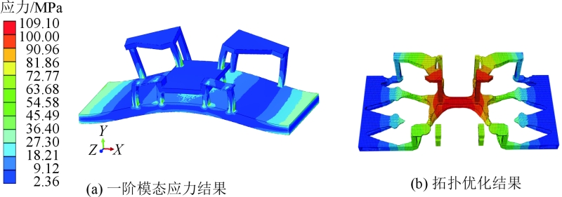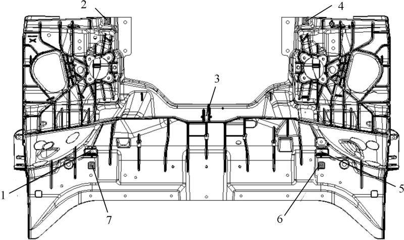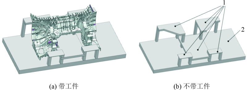圖3 雙機(jī)器人切削加工單元 XY平面方向定位:前艙鑄件外形尺寸巨大,相比傳統(tǒng)的壓鑄件,鑄件的變形量也較大。經(jīng)過壓鑄模擬分析,發(fā)現(xiàn)在壓鑄工藝的中部區(qū)域以及前端部位,鑄件的變形程度相對較小,即便存在變形情況,也主要表現(xiàn)為從中間向輪轂兩端的方向輕微拉長。圖4為前艙鑄件的機(jī)加工定位示意圖。 前艙鑄件的尺寸較大,為1 650 mm×950 mm×630 mm,這給相關(guān)的夾具設(shè)計帶來了全新的挑戰(zhàn)。按照傳統(tǒng)的夾具設(shè)計模式來進(jìn)行設(shè)計,夾具的質(zhì)量將會增大,甚至可能達(dá)到2.5 t。然而, CNC設(shè)備的第6軸轉(zhuǎn)臺的承重能力最大僅為1.2 t。這說明按照傳統(tǒng)方式設(shè)計的夾具質(zhì)量將遠(yuǎn)超過轉(zhuǎn)臺的承重能力,從而無法進(jìn)行正常的加工操作。為了克服這一難題,需要對前艙鑄件的夾具整體框架結(jié)構(gòu)進(jìn)行輕量化設(shè)計,通過夾具鏤空減重技術(shù),將夾具質(zhì)量控制在1 t左右。根據(jù)夾緊位置和輔助支撐位置,確定出夾具的大致構(gòu)造,見圖5,由1個基座和5個平臺構(gòu)成。對圖5的結(jié)構(gòu)進(jìn)行一階模態(tài)分析和施加載荷進(jìn)行拓?fù)鋬?yōu)化,結(jié)果見圖6。