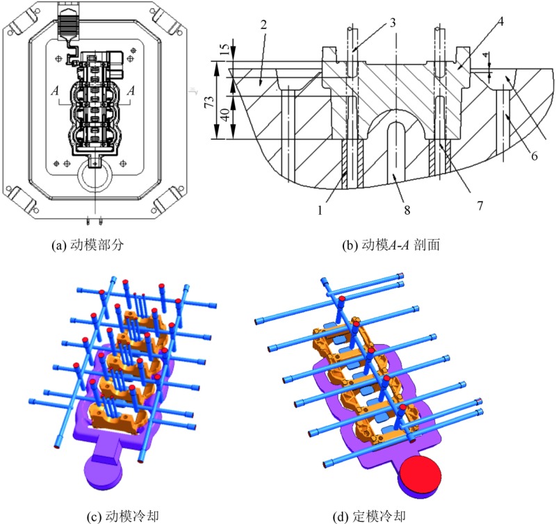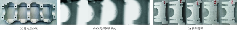 圖6 模具結構示意圖 主軸承座模具壓鑄生產的設備為ZDC-900TCS,配備史杰克西定量爐,鋁液溫度設定為(665±15) ℃。慢壓射速度為0.25 m/s, 快壓射速度為3.5 m/s,增壓壓力為110 MPa,射出增壓時間為10 s,冷卻時間為15 s。壓鑄過程采用自制真空系統,真空度達到10~20 kPa。在連續生產過程中監控模具型腔溫度,在(180±30) ℃工藝要求范圍內。壓鑄試生產500件,見圖7??梢钥闯觯T件毛坯無冷隔、留痕、擦傷等外觀缺陷,鑄件毛坯去除澆口清理飛刺后進行拋丸處理,拋丸后鑄件見圖7a。試生產零件100%進行X光探傷,重點檢測主軸座軸頸位置內部質量, X光探傷結果見圖7b。同時抽取10件毛坯對軸頸處進行剖切,剖切面質量見圖7c。通過X光探傷結合剖切面質量分析,可見鑄件內無大于2 mm的縮孔縮松,內部質量符合客戶的要求并優于CKD零件;主軸承座5個軸頸處,第3軸頸(中間軸頸)和第5軸頸(最后填充)內部質量略差。