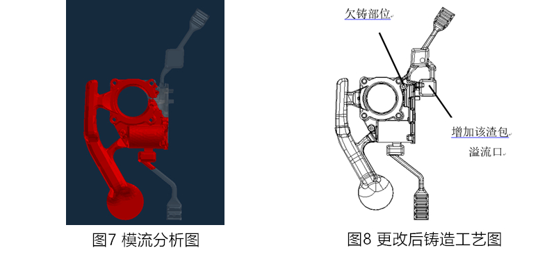 針對齒輪箱周邊的欠鑄,通過模流分析(見圖7)發(fā)現,欠鑄部位(見圖8)為進料的末端,且該部位沒有排溢系統,沒法將冷料及型腔內氣體排出,因此考慮在該部位附近增加一處渣包及溢流口,更改后鑄造工藝圖見圖8。