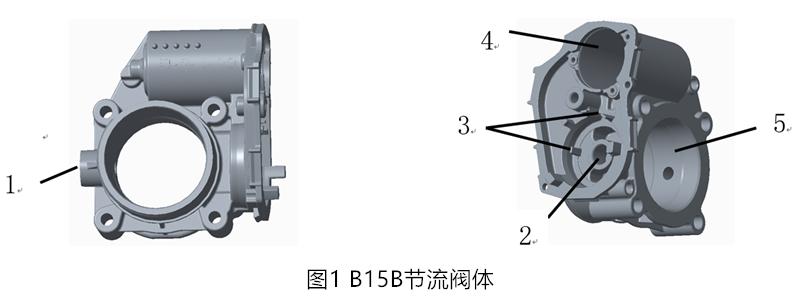 ![]() 1、左側節(jié)氣門軸孔 2、右側節(jié)氣門軸孔 3、齒輪箱彈簧限位小柱子 4、電機孔 5、進氣孔環(huán)帶 文章介紹B15B閥體產品結構,模具結構以及生產過程中出現的問題,運用模流分析,對模具的進料系統及排溢系統做了分析改進,解決了節(jié)流閥體在生產過程中出現的問題,有效降低了產品廢品率。 B15B產品零件結構 B15B節(jié)流閥體零件(圖1)。最大外形尺寸107 mm ×103 mm × 63 mm,最小壁厚為1.7 mm,最大壁厚為5 mm,平均 壁厚為3 mm,質量約為400g。該產品在齒輪箱側有2處彈簧限位小柱子, 最小端只有1.3 mm,高度為9 mm。 模具設計方案 模具結構見圖2,鑄造工藝圖見圖3。1模1件,采用3個滑塊,考慮到滑塊尺寸較大,3個滑塊均為油缸抽芯。橫澆道通過右側鑲塊,合金液沿橫澆道從右側滑塊底部進料口進入型腔。設計使用4000kN壓鑄機,采用φ60mm沖頭。