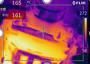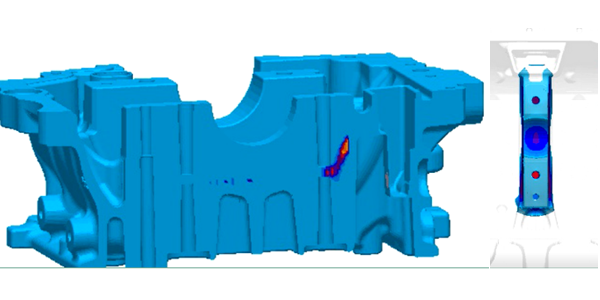 圖2 曲軸箱軸承孔油道附近縮孔 縮孔相關(guān)對策 鋁合金壓鑄件產(chǎn)生鑄造缺陷的原因有產(chǎn)品本身的結(jié)構(gòu)特征、模具設(shè)計(jì)得澆注系統(tǒng)及冷卻系統(tǒng)設(shè)計(jì)不合理、工藝參數(shù)設(shè)計(jì)不合理等原因[1~4]。根據(jù)常見的鑄造缺陷原因以及鋁合金鑄件缺陷處理流程,探索解決鋁合金壓鑄件厚大部位縮孔的相應(yīng)對策。 前期分析及對策 鑄件縮孔的前期分析從容易操作的工藝參數(shù)出發(fā),通過現(xiàn)場測量及觀察,測得模具內(nèi)澆口厚度為4 mm,計(jì)算的內(nèi)澆口速度為40 m/s,產(chǎn)品壁厚最薄處為4.6 mm;料餅厚度為25 mm;鑄造壓力為60MPa。由經(jīng)驗(yàn)可知,模具設(shè)計(jì)符合產(chǎn)品的結(jié)構(gòu)特征,模具澆注系統(tǒng)應(yīng)該不存在增壓階段補(bǔ)縮不足的問題。但是,增壓階段的鋁液補(bǔ)縮與料餅厚度和增壓壓力有直接的關(guān)系,合適的料餅厚度與鑄造壓力才能形成內(nèi)部組織致密的鑄件,因此,可以懷疑縮孔是由鑄造壓力偏低和料餅偏薄而導(dǎo)致的。 前期消除鑄件縮孔的對策分為兩個(gè):①鑄造壓力由之前的65MPa提高至90MPa;②料餅厚度有原來的25 mm調(diào)整為30 mm。采用上述措施后,經(jīng)過小批量專流驗(yàn)證,縮孔率由5%減低為4.8%,效果不明顯,說明工藝參數(shù)不是引起鑄件縮孔的主因。 中期分析及對策 由于引起鑄件縮孔的本質(zhì)原因是鋁液凝固時(shí)補(bǔ)縮不足而導(dǎo)致,而模具溫度分布不均容易導(dǎo)致鋁液凝固順序不合理,從而補(bǔ)縮不足,因此,中期對策分析主要從確保合理的模具溫度入手。由產(chǎn)品3D模型可知,鑄件縮孔處壁厚為22.6mm,壁厚較大,容易引起較高的模具溫度。鋁液凝固時(shí),壁厚較大鑄件內(nèi)部鋁液由于溫度較高,尚處于液相或者固液混合相,而此時(shí)內(nèi)澆口進(jìn)行補(bǔ)縮的通道可能已經(jīng)凝固。這樣,在增壓階段鑄件無法進(jìn)行鋁液補(bǔ)縮,從而有形成縮孔的可能。為確保合適的模具溫度,采用熱成像儀測得脫模劑噴涂后模具最高溫度為272 ℃(見圖3),高于正常的模具噴涂后溫度,其他區(qū)域模具溫度及其分布整體正常。因此,需要降低縮孔處模溫。另外,測得此處冷卻水孔底部距離模具型腔表面距離較大為20 mm,因?yàn)檩^大的熱傳遞距離會降低模具的冷卻效果,所以需要對冷卻水孔進(jìn)行更改。