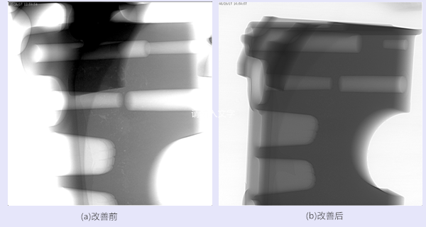 圖4 鑄件凝固階段的多孔性 鑒于常規(guī)增壓階段壓射沖頭通過料餅施加鑄造壓力而實(shí)現(xiàn)補(bǔ)縮作用,采取的措施是在鑄件縮孔附近增加一個(gè)類似渣包結(jié)構(gòu)來充當(dāng)料餅,利用一副油缸抽芯機(jī)構(gòu)充當(dāng)沖頭,在鑄件凝固后期對易產(chǎn)生縮孔的區(qū)域進(jìn)行二次增壓補(bǔ)縮,以達(dá)到消除縮孔的目的。通常來講,這樣的二次加壓機(jī)構(gòu)叫做擠壓銷,它的加壓原理是在金屬液或合金液澆注后到完全凝固前施加適當(dāng)?shù)膲毫σ约訌?qiáng)鑄件凝固補(bǔ)縮效果,達(dá)到提高鑄件致密度、減小或消除縮孔的目的。加壓凝固能夠改變金屬及其合金物理參數(shù)和結(jié)晶過程,改變疏松空洞的分布和尺寸,提高鑄件的致密度,改善鑄件的拉伸強(qiáng)度和硬度等性能。 根據(jù)鑄件補(bǔ)縮、增壓規(guī)律,擠壓銷動作信號采用鑄造過程的增壓信號,并在此基礎(chǔ)上延遲作為啟動信號,因此,擠壓銷主要控制擠壓深度和擠壓延遲時(shí)間兩個(gè)參數(shù)。擠壓深度依鑄件結(jié)構(gòu)和縮孔分布、大小而定,一般為10~20 mm;擠壓延時(shí)主要參考增壓時(shí)間設(shè)定,一般為2~5 s。實(shí)際工程中,擠壓參數(shù)的確定是在經(jīng)驗(yàn)值的基礎(chǔ)上根據(jù)鑄造情況再作優(yōu)化。為了方便調(diào)整擠壓參數(shù),通常采用單獨(dú)油缸控制擠壓銷動作。 針對曲軸箱鑄件,后期的改善措施為在模具軸承孔附近對稱布置兩根擠壓銷(位置見圖5),通過調(diào)整擠壓深度和擠壓延時(shí)兩個(gè)主要參數(shù),優(yōu)化擠壓銷的二次加壓的補(bǔ)縮效果,從而降低鑄件縮孔率。在前述措施的基礎(chǔ)上,模具追加兩根擠壓銷后縮孔率明顯下降,不良率由4%降低到0.2%。同時(shí),在0.2%的縮孔不良品中,其縮孔大小明顯減小。因此,擠壓銷方案對于控制壁厚加大的鑄件縮孔率起到了較好的作用。但是,在本次改善過程中,鑄件縮孔不良率也曾出現(xiàn)過波動現(xiàn)象,通過優(yōu)化擠壓參數(shù)擠壓深度15 mm、擠壓延遲時(shí)間2.5 s和規(guī)定擠壓銷使用壽命(次/8000模)等相關(guān)規(guī)范,使鑄件不良率穩(wěn)定在0.2%附近。 圖6為鑄件縮孔區(qū)域改善前后的X射線探傷對比照。可以看出,鑄件縮孔出現(xiàn)在軸承孔附近,分布較廣且分散,組織較為疏松,由于汽缸體軸承孔需要通以壓力潤滑油,因此鑄件在使用期間存在漏油風(fēng)險(xiǎn);通過改善后,從X射線探傷照片上已看不出疏松的縮孔分布,鑄件內(nèi)部組織顯得更加致密。
