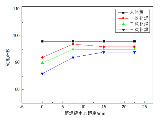 表3:力學性能檢測結果 硬度試驗 圖6為未補焊、一次補焊、二次補焊、三次補焊試樣經過熱處理后焊接中心、離焊接中心區域7.5、15、22.5 mm處的硬度??梢钥闯?,未補焊試樣熱處理后硬度(HB)最高達到98,三次補焊試樣熱處理后硬度(HB)最低,只有86,隨著補焊次數的增加,試樣整體硬度呈遞減趨勢,不過試樣硬度只有小幅度降低,遞減趨勢不明顯,試樣硬度仍明顯高于HB962-2001標準中硬度(HB)的要求。從圖7中還可以觀察到,一次補焊、二次補焊、三次補焊熱處理后,補焊熔合區硬度均低于母材硬度,三次補焊后硬度下降了12.2%。
