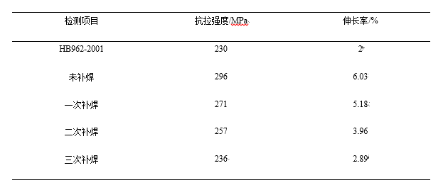 圖5 X射線探傷底片 拉伸試驗 分別對未補焊、一次補焊、二次補焊、三次補焊的試樣按照試驗步驟進行T6熱處理。表3為抗拉強度和伸長率測試結果。可以看出,每次補焊后試樣抗拉強度、伸長率均有所減小,且斷裂位置均在焊接區域。一次、二次、三次焊接熱處理后與未焊接試樣相比,抗拉強度分別降低8.4%、13.1%、20.3%,伸長率分別降低14.1%、34.3%、52.1%。但多次補焊和熱處理的試樣抗拉強度、硬度均高于標準要求,這是由于低壓鑄造方式的優越性使鋁合金的性能大幅度提高,可以補充流線缺陷對鋁合金性能的不利影響。