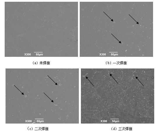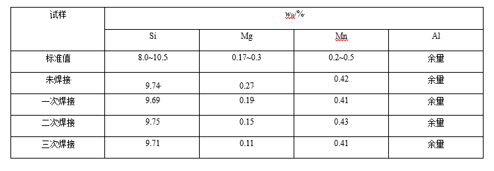 表3 不同焊接次數中心區域化學成分 三:結論 (1)隨著焊接和熱處理次數的增加,ZL104抗拉強度逐漸降低,一次、二次、三次焊接熱處理后抗拉強度相對于未焊接熱處理試樣分別下降8.4%、13.1%、20.3%。 (2)隨著焊接和熱處理次數的增加,ZL104伸長率下降明顯,一次、二次、三次焊接熱處理后抗拉強度分別下降14.1%、34.3%、52.1%。 (3)隨著補焊次數的增加,硬度整體有降低趨勢,焊接中心區域硬度相對母材降低最為明顯。 (4)鑄造原始鑄態組織為枝晶組織,組織不致密,隨著焊接次數的增加顯微氣孔數量有所增加導致試樣伸長率和強度降低。 (5)焊接中心區域,Mg含量降低,導致析出增強相Mg2Si減少,ZL104合金強度和硬度也有所降低。 作者: 何益可,周中波,林琳,王笑,張飛飛 西安西工大超晶科技發展有限責任公司 |