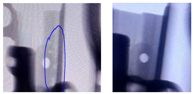 圖4/figure 4 從圖4的結果可以得出:即使隨著鑲塊的逐漸老化(界面傳熱系數降低),3D打印鑲塊的溫度都比傳統鑲塊的低了近50℃。這說明3D打印的冷卻效果要好很多,而且③號3D打印冷卻水路因散熱面積大而冷卻效果在早期使用過程中更好。 在實際中,采用了3D打印鑲塊后,產品質量明顯改善,探傷縮孔缺陷大大減少,試漏測試后廢品率下降至2%以下。圖5是改善前后產品探傷結果對比: