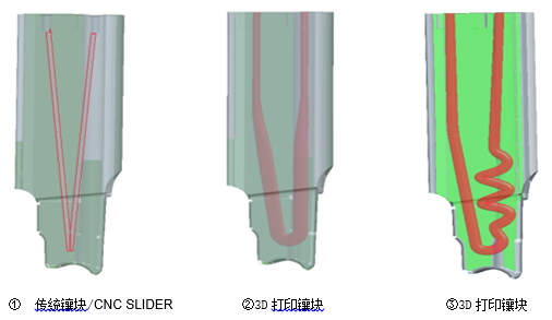 圖2/figure 2 通過圖2結果中的某點的數據對比證實:隨著界面傳熱系數的降低鑲塊本體溫度也在降低。 基于這個事實,為了提高鑲塊的使用壽命,保持良好的傳熱和冷卻條件,優化傳統CNC加工冷卻水路變得必要。因此,借助先進的3D打印技術,突破傳統CNC加工冷卻水路的限制,通過隨型冷卻和擴大冷卻水路散熱面積來確保鑲塊的快速冷卻。如圖3,是傳統CNC和3D打印鑲塊和冷卻水路設計對比: