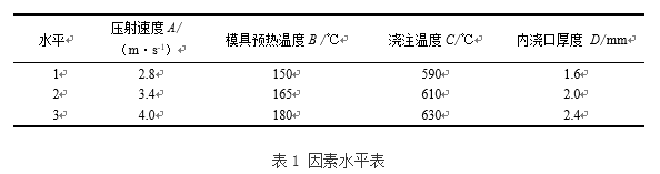 四、正交試驗設計及工藝參數優化 正交試驗設計 影響壓鑄件質量的因素有很多,例如內澆口的厚度大小及模具預熱溫度、澆注溫度、壓射速度等 。選擇壓射速度(A)、模具預熱溫度(B)、澆注溫度(C)、內澆口厚度(D)為因素,以充型時間、凝固時間、縮孔縮松量及裹氣量為指標建立4因素3水平正交試驗表。其中,縮孔、縮松量由平均體積分數來表示。表1為因素水平表,表2為正交試驗結果表。