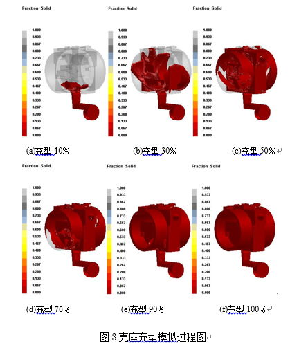由圖3可知,金屬液經過直澆道、橫澆道及內澆口后,進入型腔內,先填充中央部分,然后向型腔四周填充,直到型腔被填滿,充型過程完畢。金屬流動方式總體平穩,流動狀態較好。