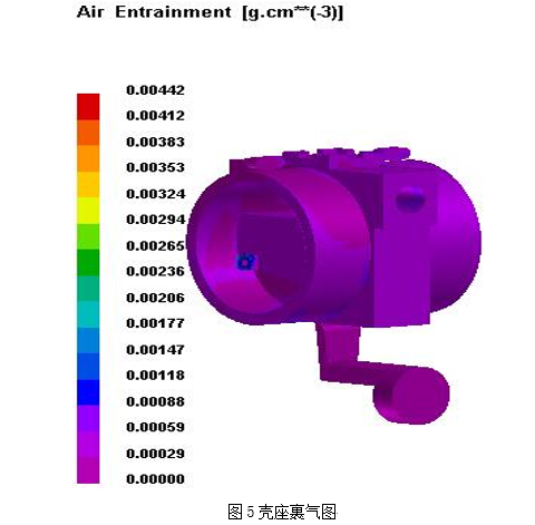 通過充型時間和充型指標兩個判斷標準來確定各組工藝參數下充型過程的好壞。充型指標是對在壓力鑄造過程中的流動狀態:層流、紊流、裹氣、沖刷、澆不足等現象的綜合評價。根據表3可知,壓射速度對鑄件充型時間的影響較大,當壓射速度越大,充型時間也就相對越少。由于在相同條件下,壓射速度越大,金屬液體進入內澆口的速度越大,導致了鑄件的充型時間越少。 凝固過程的模擬主要是觀察和分析溫度的的變化與趨勢。分析表3可知,模具預熱溫度對凝固時間的影響最大,這是因為模具預熱溫度越高,金屬液的散熱速度就越慢,凝固時間也就越長。 由表3可知,隨著壓射速度增大,鑄件的縮孔、縮松值呈現先減小再增加的趨勢。當壓射速度為3.4 m/s時,鑄件的縮孔、縮松值最?。浑S著模具預熱溫度升高,鑄件的縮孔、縮松值也呈現了先減小再增加的趨勢,在預熱溫度為165 ℃時,鑄件的縮孔、縮松值最??;隨著澆注溫度升高,鑄件的縮孔、縮松值呈現增加的趨勢,在澆注溫度在590 ℃時,鑄件縮孔、縮松值最??;適當的增加內澆口的厚度,有利于減少鑄件裹氣缺陷及補縮壓力的傳遞,內澆口的厚度為2.4 mm時,鑄件的縮孔、縮松值最小。 優化后的工藝參數 在壓鑄生產中,鑄件的縮松、縮孔值和裹氣量應盡量少,以保證鑄件的強度。在保證鑄件質量的基礎上應盡量減少充型時間及凝固時間,來縮短鑄件的生產周期,提高生產效率。因此,以縮孔、縮松值和裹氣量為主,綜合考慮來確定優化的工藝參數為A2B2C1D3,即壓射速度為3.4 m/s,模具預熱溫度為165 ℃,澆注溫度為590 ℃,內澆口厚度為2.4 mm。 五、優化后的工藝參數數值模擬 根據優化出的工藝參數對殼座進行數值模擬,圖3為殼座充型模擬過程,圖4為殼座縮孔、縮松缺陷,圖5為殼座裹氣圖。